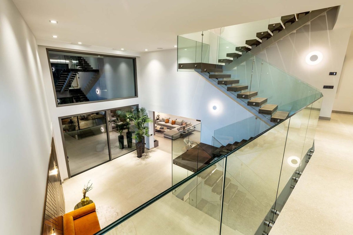 Upon entering, the double-height reception hall with a sculptural floating staircase sets the tone for the home’s refined contemporary design. The expansive living and dining areas integrate effortlessly with the outdoor terraces, creating a seamless flow ideal for entertaining. The state-of-the-art kitchen is a chef’s dream, complemented by a TV lounge, private office, and a luxurious guest suite on the ground floor.